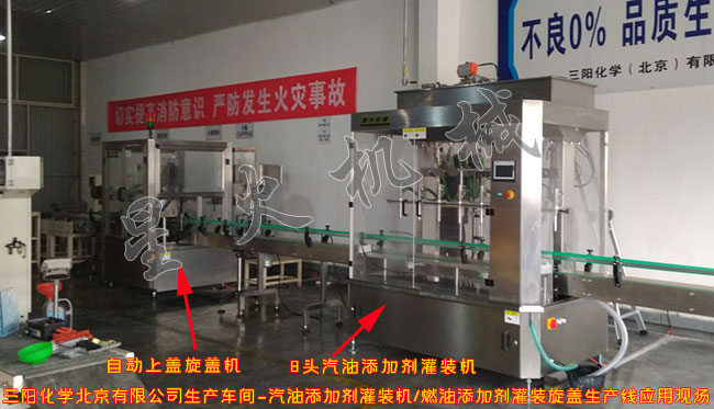 三阳化学北京有限公司是一家专业生产制造汽油添加剂、防冻液、玻璃水等汽车用品的企业,是集产品设计开发、销售生产为一体的科技型企业。近日,三阳化学为满足扩大生产规模需要,而从我司订购了一条燃油添加剂灌装旋盖生产线,用于汽油添加剂、燃油添加剂、防冻液、冷却液、玻璃水、车用添加剂等产品的灌装生产。目前,燃油添加剂灌装旋盖生产线已在三阳化学北京有限公司车间投入生产,生产效率得到大大提升,客户很满意!
